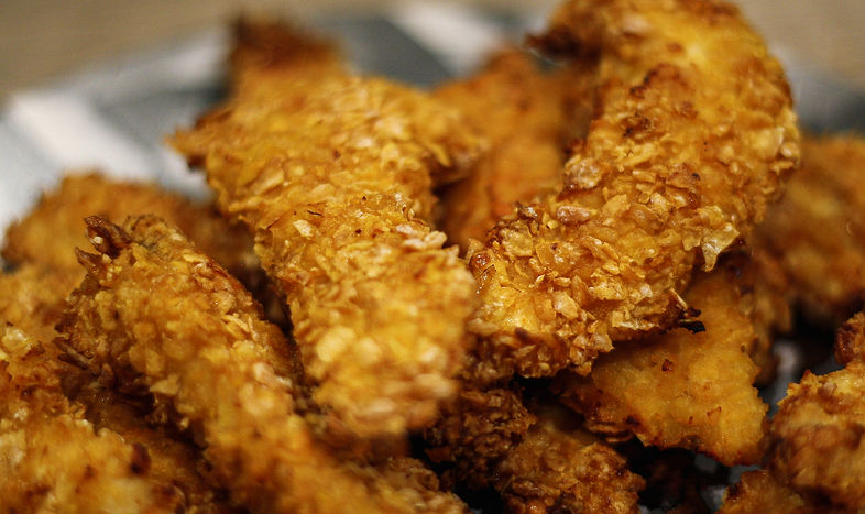 Une fois les 2 heures passées, pour chaque morceau, plongez-les une fois dans la farine, puis dans l'oeuf puis dans les cornflakes et placez-les sur une assiette.
